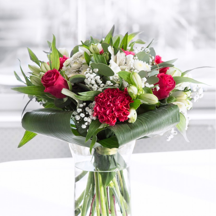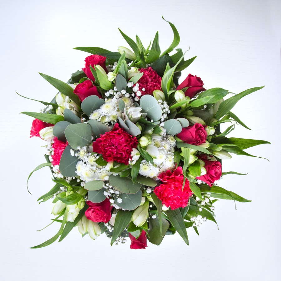 The mix of red roses and white chrysanthemums was breathtaking. Delivered promptly as promised.